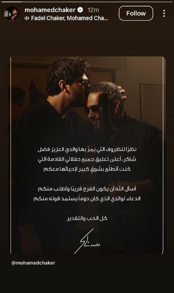 وقال الفنان محمد شاكر في منشور له : “نظراً للظروف التي يمرّ بها والدي فضل شاكر، أعلن تعليق كافة حفلاتي المقبلة التي كنت أتطلع بشوقٍ كبير لإحيائها معكم”.